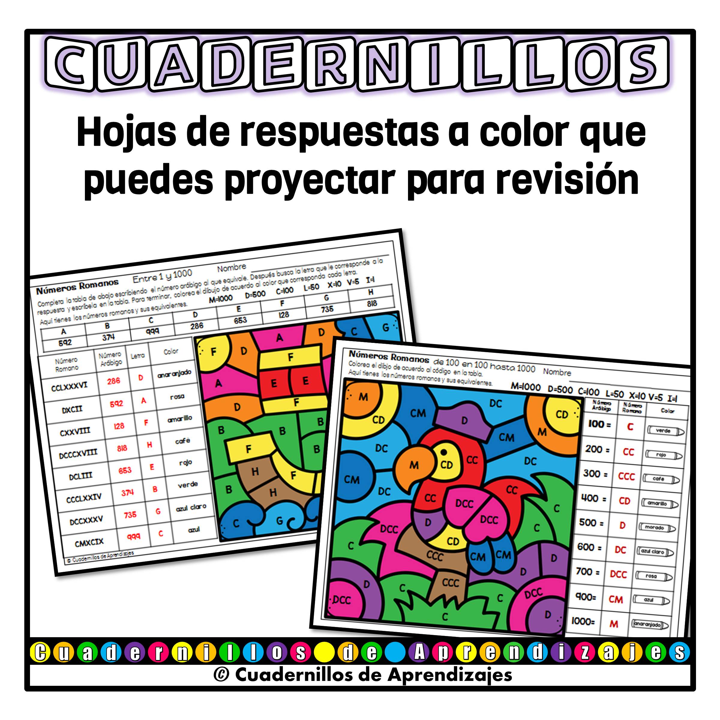 Las hojas de respuestas a color las puedes imprimir para referencia o puedes usar proyector o computadora para que los estudiantes se revisen solos.