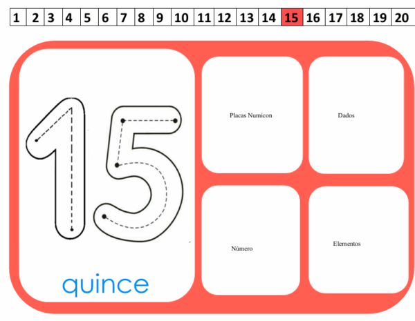 Este cuadernillo abarca los números del 11 al 20, presentando en cada página tarjetas asociadas a la cantidad de elementos, el dado, el número y la placa Numicon correspondiente, favoreciendo el aprendizaje concreto y visual del concepto numérico.