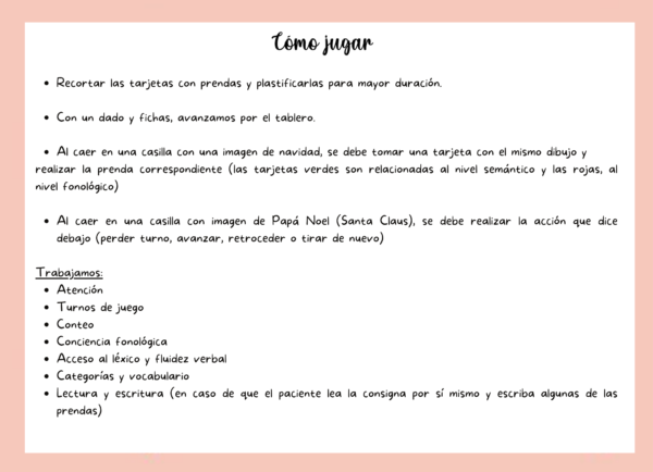 Actividad para trabajar la conciencia fonológica, el acceso al léxico, la fluidez verbal, categorías semánticas, vocabulario y turnos de juego.
