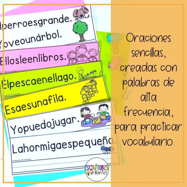 Con este recurso, tus estudiantes practicarán la separación de palabras en oraciones sencillas. Estas oraciones son adecuadas para estudiantes de primer grado, pues están creadas con palabras de alta frecuencia que les ayudan no solo a separar palabras sino a practicar lectura.