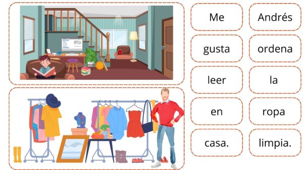 Una vez que las oraciones están ordenadas, los estudiantes deben identificar y asociar cada oración con la imagen correspondiente, reforzando la relación entre texto e imagen y fomentando la comprensión visual. -