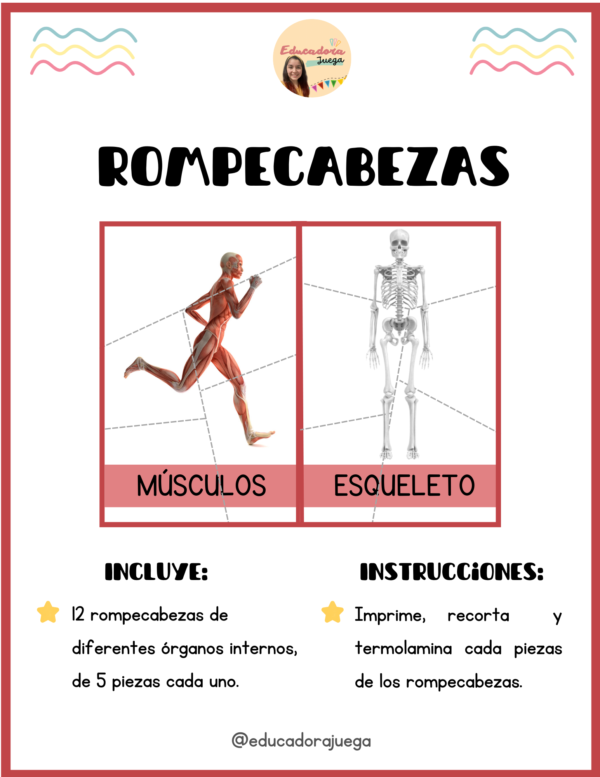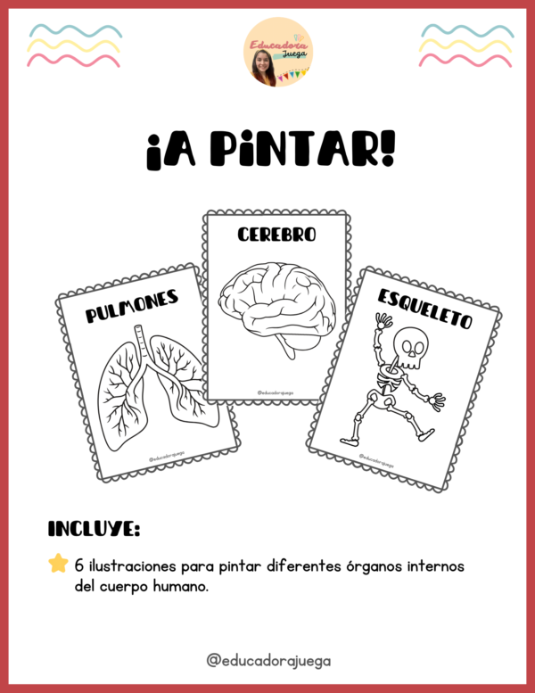 Este pack contiene 4 juegos/actividades sobre el cuerpo humano, contempla 12 conceptos: cerebro, corazón, pulmones, alvéolos, estómago, músculos, articulaciones, esqueleto, columna vertebral, fémur, cráneo y costillas.