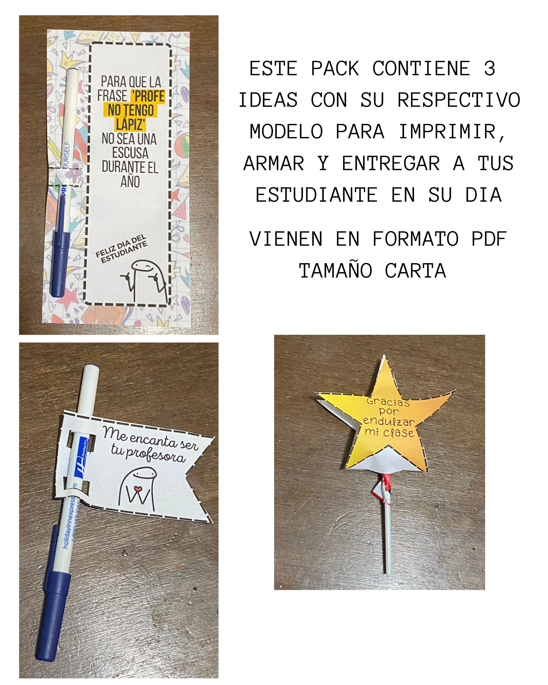 ¿ Aburrido de las mismas frases en los recuerdos para tus estudiantes ? ¿ Buscas ”regalos para el día del estudiante” en Pinterest y no encuentras nada ? ¿No sabes que hacer para tus estudiante este día ? Acá esta la respuesta : Este pack incluye 3 Ideas listas para imprimir para regalar a tus estudiantes en este día , es solo imprimir (Algunos modelos son Blanco y Negro para ahorrar en tinta 😉 Recortar , Pegar y Listo !