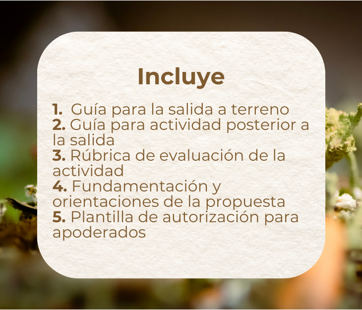 Además, encontrarás la fundamentación teórica detrás de esta propuesta, así como orientaciones para la implementación de este material. En total, ¡son cinco archivos que puedes utilizar para potenciar tus salidas a terreno!