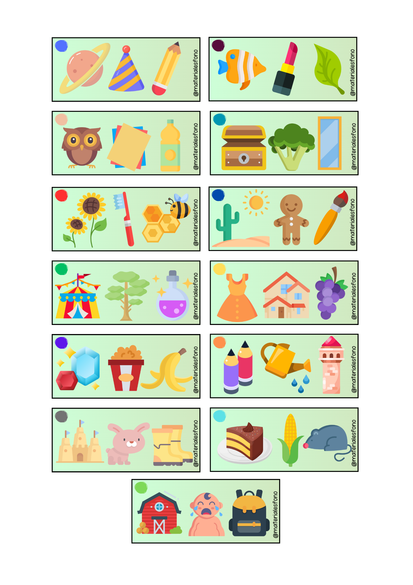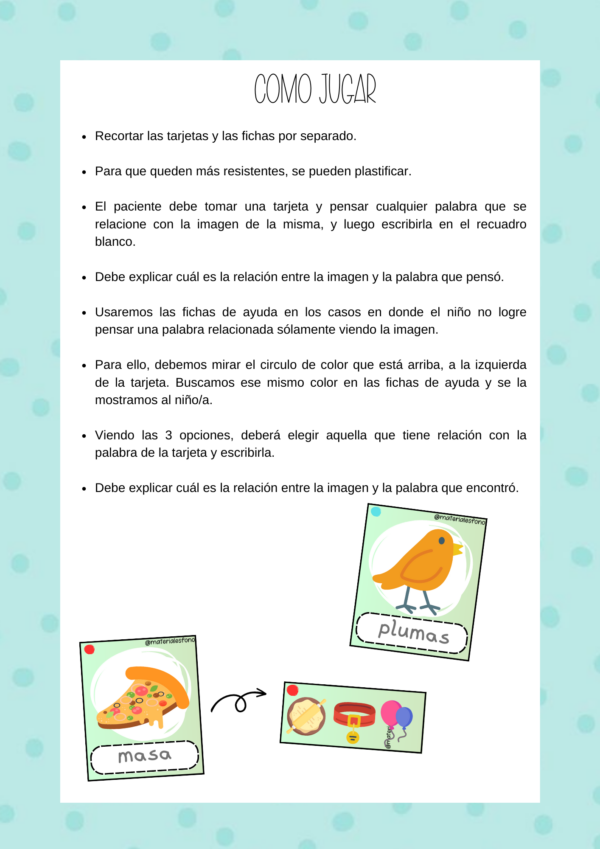 - 27 fichas de ayuda visual, con 3 opciones de imágenes para encontrar la palabra relacionada.