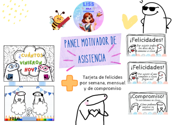 Les dejo el siguiente panel para motivar la asistencia, además incluye tarjetas de felicitaciones semanales, mensuales y compromiso.