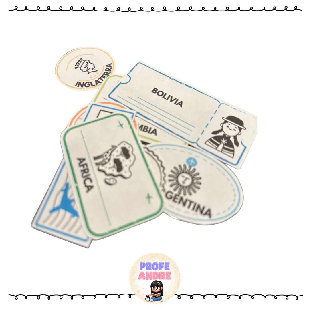 – Sellos para ir pegando, vienen una propuesta y unos para completar (Se sugiere imprimir estos sellos en papel adhesivo .