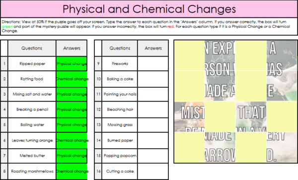 This self-checking digital puzzle includes 16 exercises where students have to decide if the change that is described is a physical or a chemical change.
