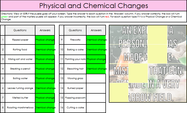 This self-checking digital puzzle includes 16 exercises where students have to decide if the change that is described is a physical or a chemical change.
