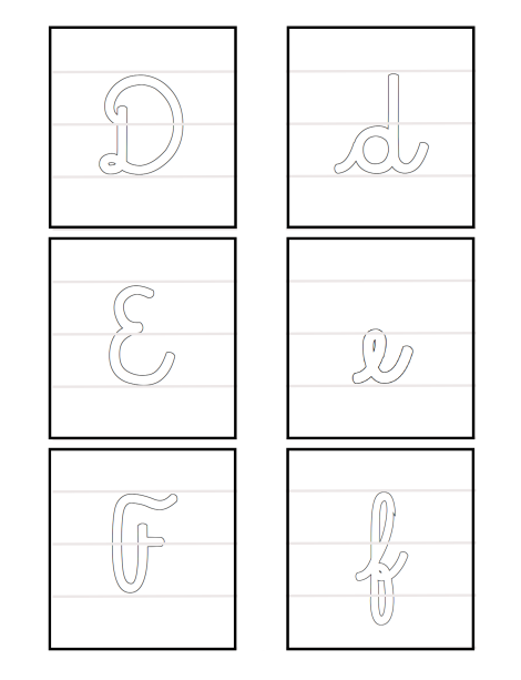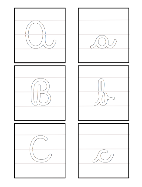 Este material contiene el abecedario en letra LIGADA, con sus respectivas MAYÚSCULAS y MINÚSCULAS, para ser recortadas por el borde rectangular y coloreadas en su interior. Formato PDF, 9 páginas.