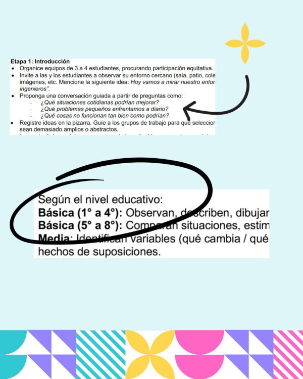 Recurso pedagógico diseñado para docentes que desean implementar el enfoque STEM de manera clara, estructurada y sin partir desde cero. Esta planificación propone una experiencia auténtica donde las y los estudiantes identifican un problema de su entorno cercano, formulan una pregunta esencial y diseñan una solución mediante el trabajo colaborativo y la experimentación.