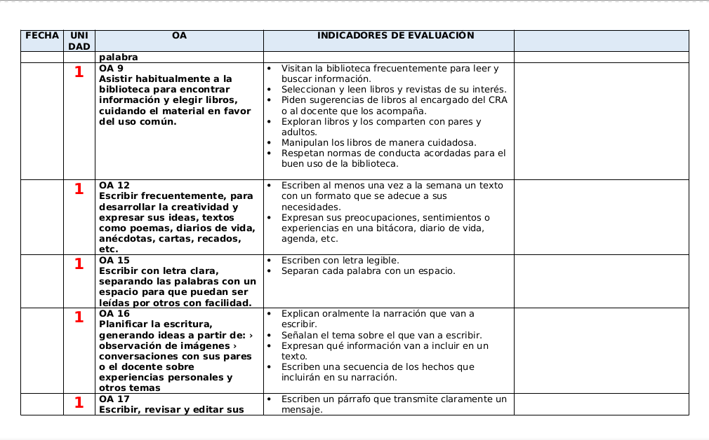 - Además se ha dejado a la derecha una columna vacía para que el/la docente la complete con actividades y/o evaluaciones.