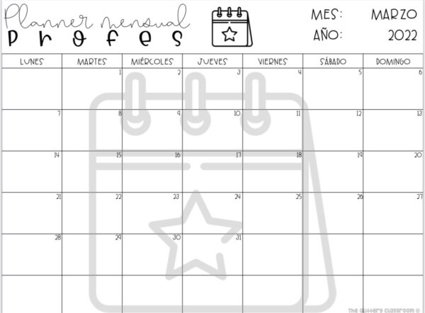 Versión en español del Monthly Teacher Planner para este 2022.