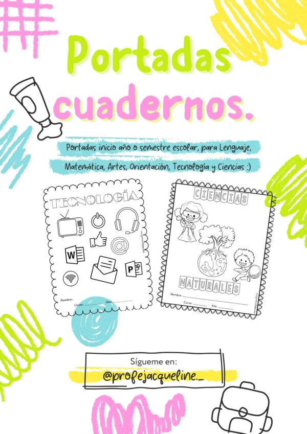 Portadas de inicio de año o semestre escolar, para las asignaturas: Lenguaje, Matemática, Orientación, Tecnología, Artes visuales y Ciencias naturales.