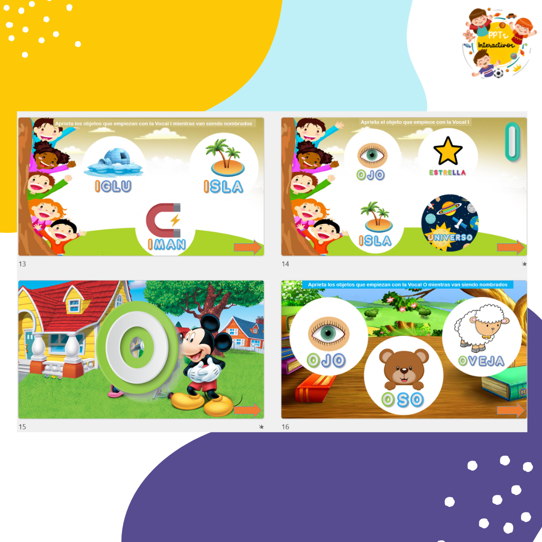 - Enfocado en el reconocimiento visual de las vocales y sonido inicial vocálico.