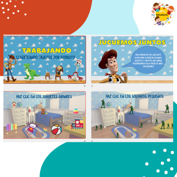 Etiquetas: atributo, clasificacion, color, forma, gamificación, juego interactivo, Kinder, power point interactivos, Pre- Kínder, preescolar, tamaño, toy story