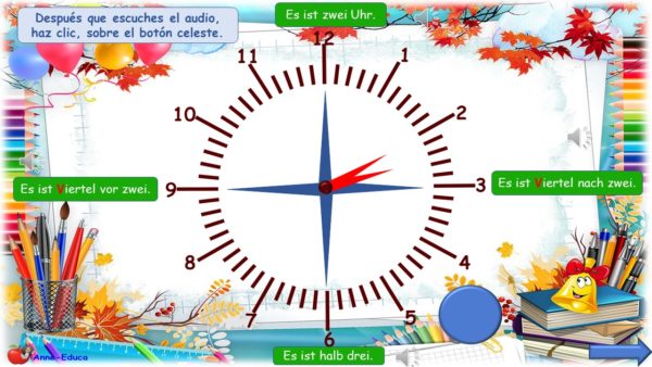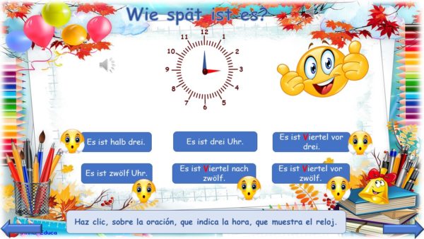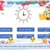 PPT interactivo para aprender la a leer la hora en Alemán. Hora , media hora y cuarto de hora. Con audio para ayudar a la pronunciación. Tiene instrucciones en castellano por si se les envía a los estudiantes para que lo practiquen en casa. El PPT es editable. Nivel 3° Básico para colegios alemanes de Chile.
