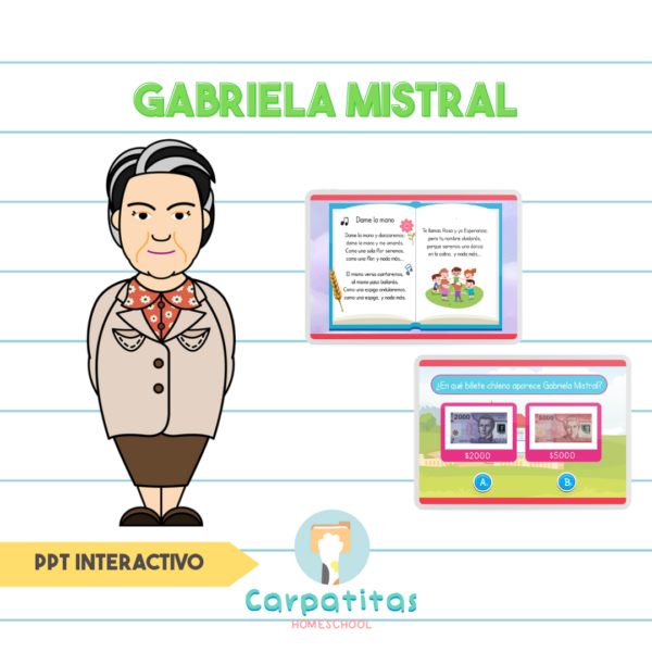 Este PPT interactivo (editable) contiene 31 diapositivas con 4 actividades sobre la poeta chilena: vida, poemas ilustrados, trivia y comprensión lectora.