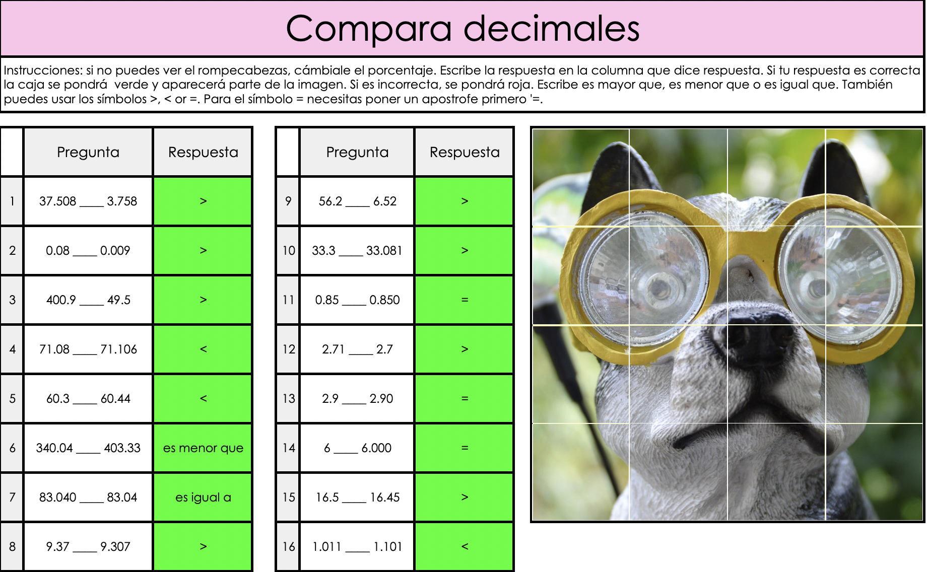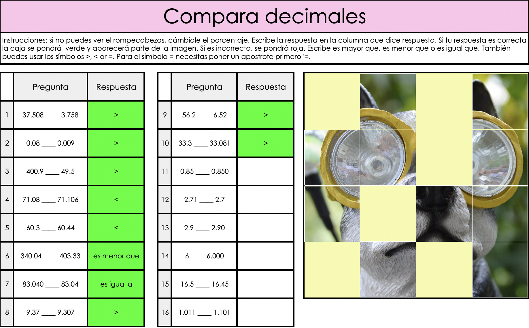 ¡Esta actividad es para ti! Es un rompecabezas misterioso que se auto califica. Incluye 16 ejercicios en los que los estudiantes deberán comparar dos números decimales.