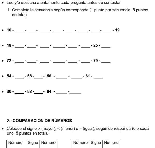 Esta prueba evalúa el dominio de conceptos matemáticos básicos para estudiantes de primer año de enseñanza básica. Incluye ejercicios de completar secuencias numéricas, comparar números, ordenar números, contar conjuntos de elementos, descomponer y componer números de manera aditiva, y completar secuencias numéricas. Los temas cubiertos incluyen conteo, comparación y ordenamiento de números, así como la comprensión de patrones y secuencias.