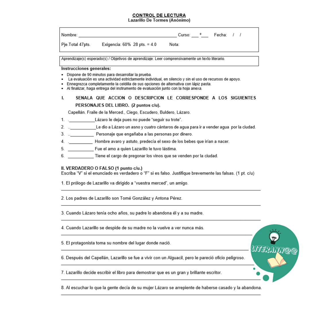 Prueba sobre “El Lazarillo de Tormes”, diseñada con un conjunto de preguntas que abordan diferentes aspectos de la obra, fomentan la comprensión y el análisis de los estudiantes.