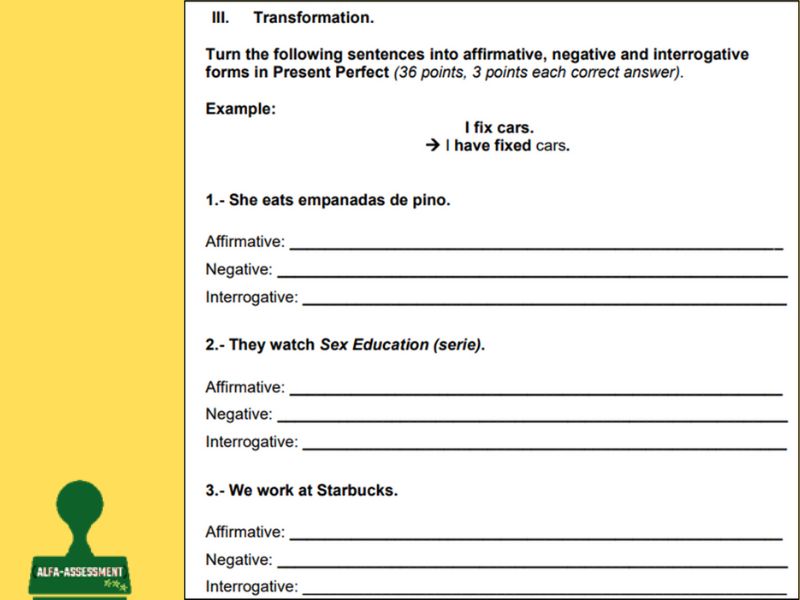 - 3 secciones: traducción, conjugación verbal y aplicación de Present Perfect en sus tres formas: afirmativa, negativa e interrogativa.