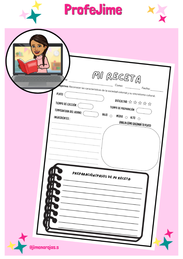 Recetario para evidenciar el sincretismo cultural en América. Incluye el objetivo de la clase. Así tus estudiantes registran un plato de comida que incluya alimentos españoles y americanos. Se puede trabajar en 5to y 8avo básico.