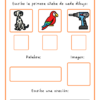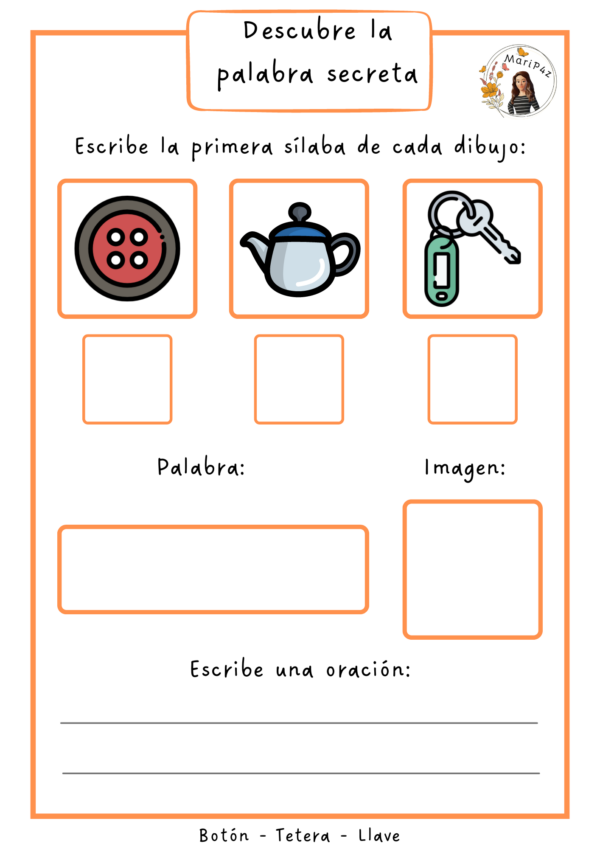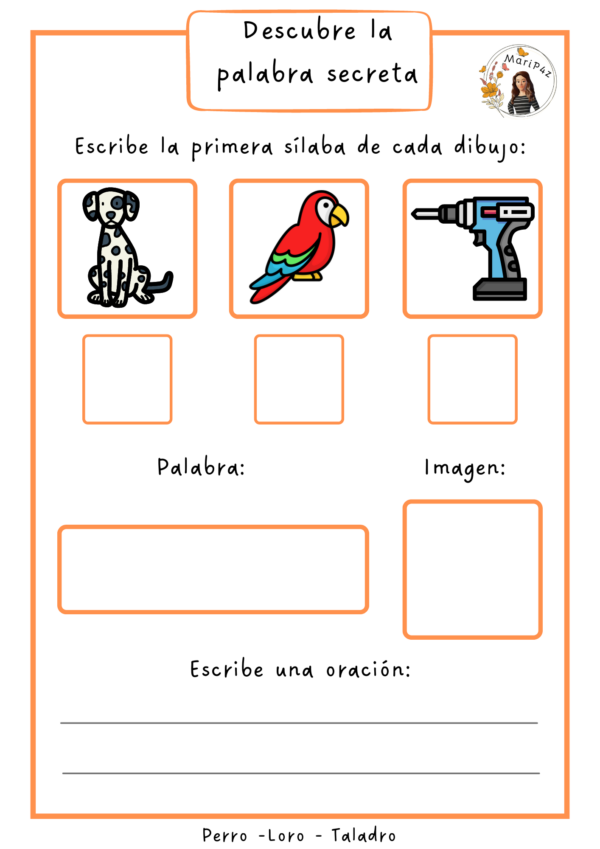 En la siguiente actividad, los estudiantes deben escribir la sílaba inicial de cada dibujo, para luego, juntar estas y descubrir la palabra secreta, escribiéndola en el recuadro correspondiente. Luego, tendrán que ubicar la imagen alusiva, terminando con la escritura de una oración que contenga la palabra ❤️