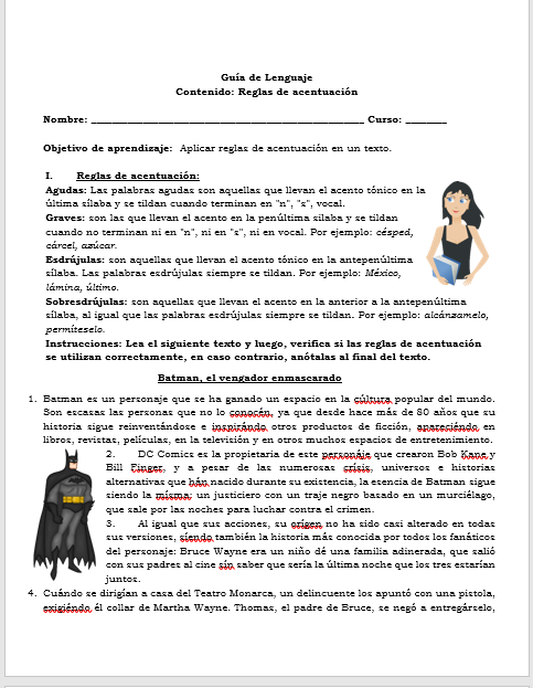 Para esto, deberán leer el texto “Batman, el vengador enmascarado” y luego buscar en el texto aquellas palabras que se encuentran acentuadas incorrectamente. He aplicado esta actividad con estudiantes de básica y media y les ha encantado.