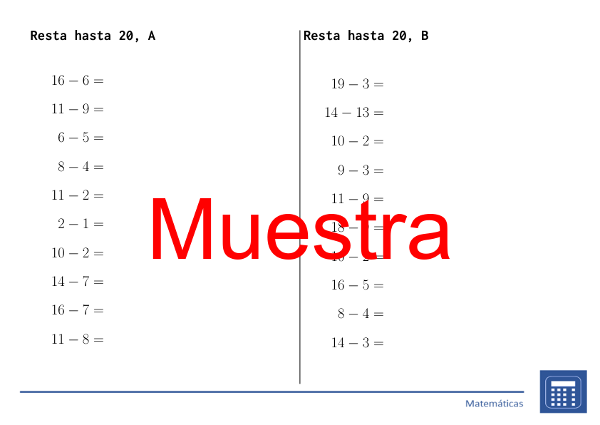 Materials required 26 sloupců (from A to Z) s 10 příklady (celkem 260 příkladů) in Odečítání do 20 spolu s řešeními těchto sloupců. Kromě toho je v dokumentu zahrnuto všech 26 sloupců (A až Z) s písmem zvětšeným na velikost 20 pro zrakově postižené studenty.