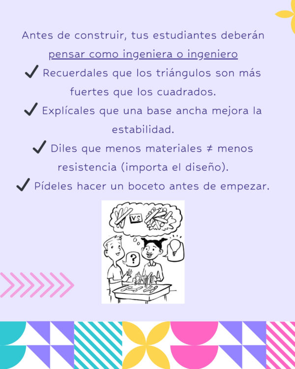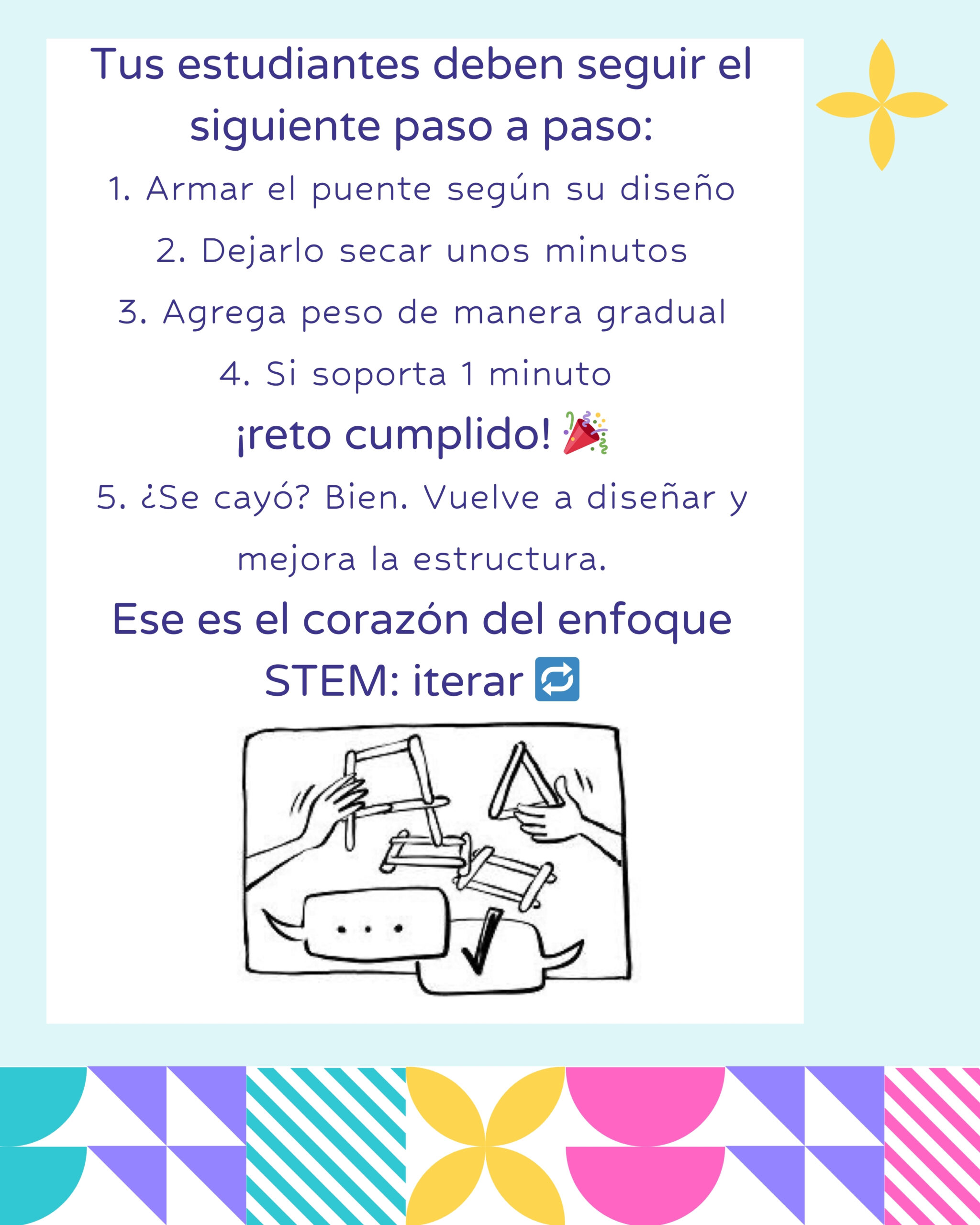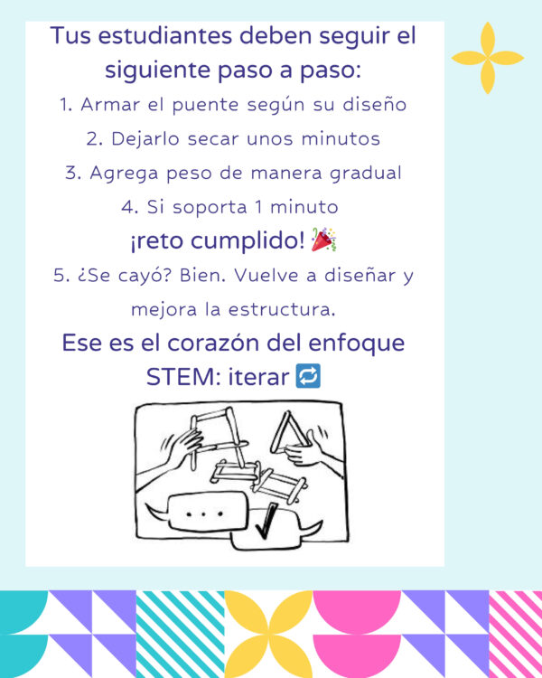 A través de este reto, el estudiantado explora tipos de puentes, formas estructurales resistentes y el uso eficiente de materiales, integrando conceptos de ciencia, tecnología, ingeniería y matemática de manera activa y significativa. El desafío promueve el aprendizaje basado en la experimentación, donde el error se convierte en una oportunidad de mejora y reflexión.