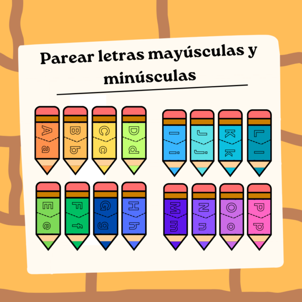 Emparejamiento de letras: Los niños pueden practicar emparejando letras minúsculas con sus correspondientes mayúsculas, ayudándoles a desarrollar habilidades de reconocimiento de letras y alfabetización.