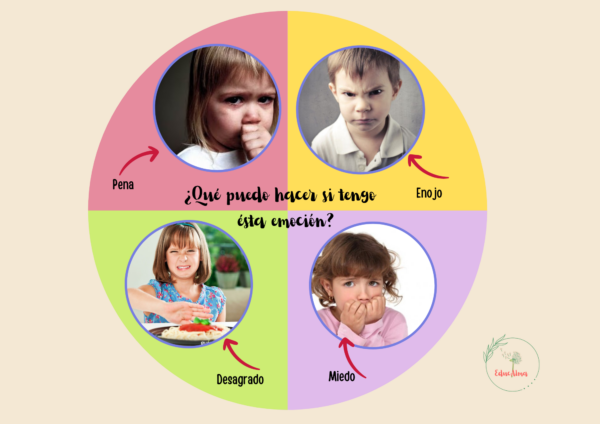Este recurso es ideal para que los niños y niñas puedan gestionar algunas de éstas emociones (enojo, pena, desagrado, miedo) a través de las actividades que allí aparecen. La idea que ellos giren la ruleta y elijan que actividad desean hacer para gestionar la emoción que están sintiendo en ese momento.