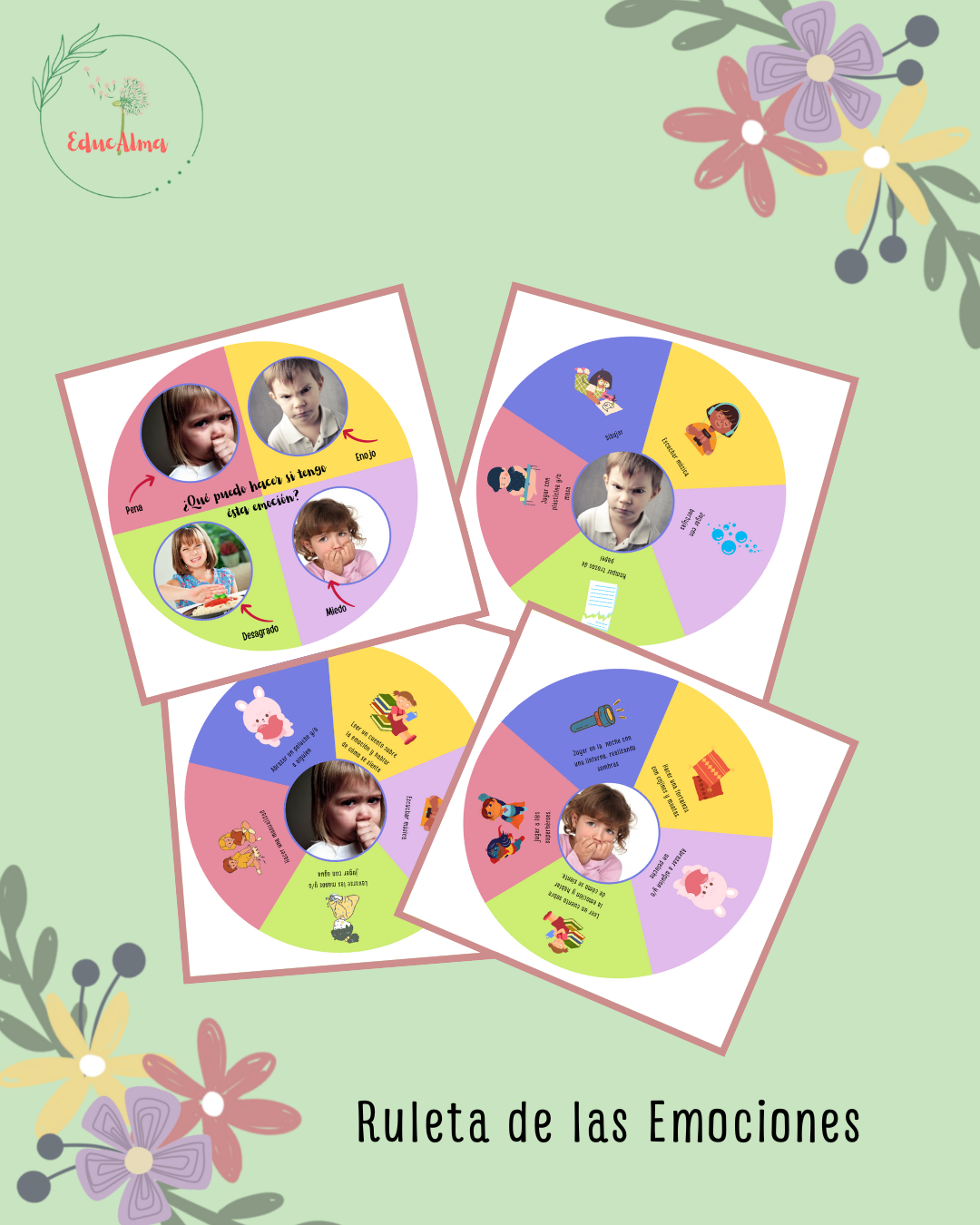 Este recurso es ideal para que los niños y niñas puedan gestionar algunas de éstas emociones (enojo, pena, desagrado, miedo) a través de las actividades que allí aparecen. La idea que ellos giren la ruleta y elijan que actividad desean hacer para gestionar la emoción que están sintiendo en ese momento.