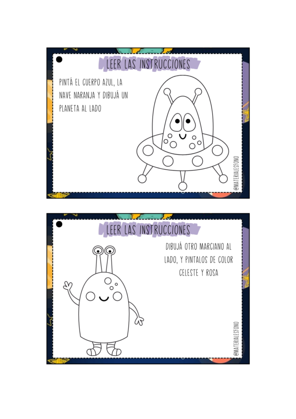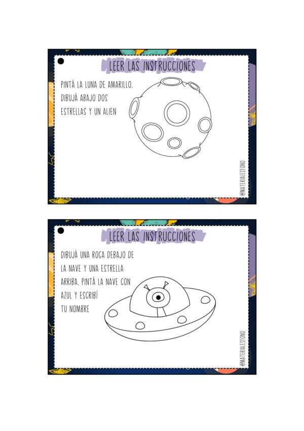 Actividad en formato “librito” con temática del espacio, para trabajar la comprensión lectora, comprensión auditiva, atención, memoria, vocabulario de colores y nociones espaciales.