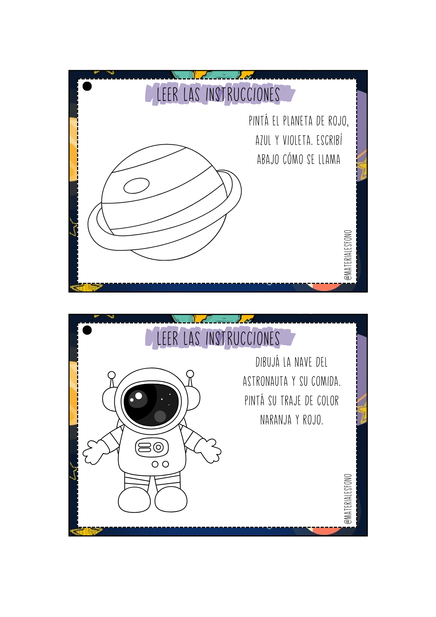 Actividad en formato “librito” con temática del espacio, para trabajar la comprensión lectora, comprensión auditiva, atención, memoria, vocabulario de colores y nociones espaciales.