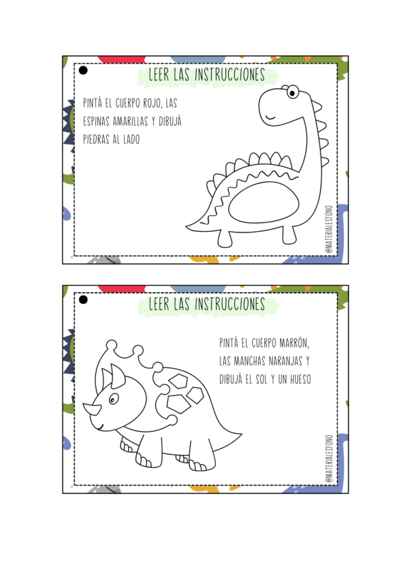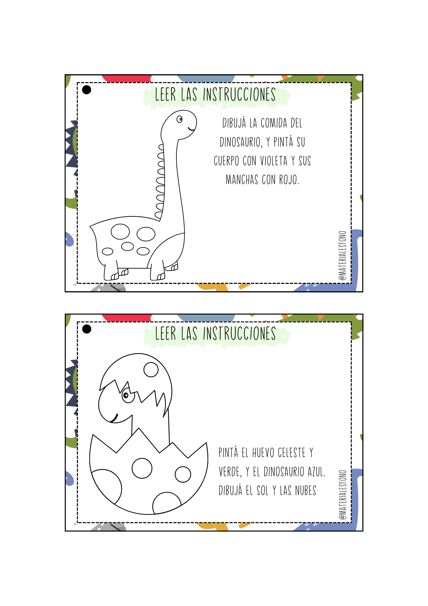 Actividad en formato “librito” con temática de dinosaurios, para trabajar la comprensión lectora, comprensión auditiva, atención, memoria, vocabulario de colores y nociones espaciales.