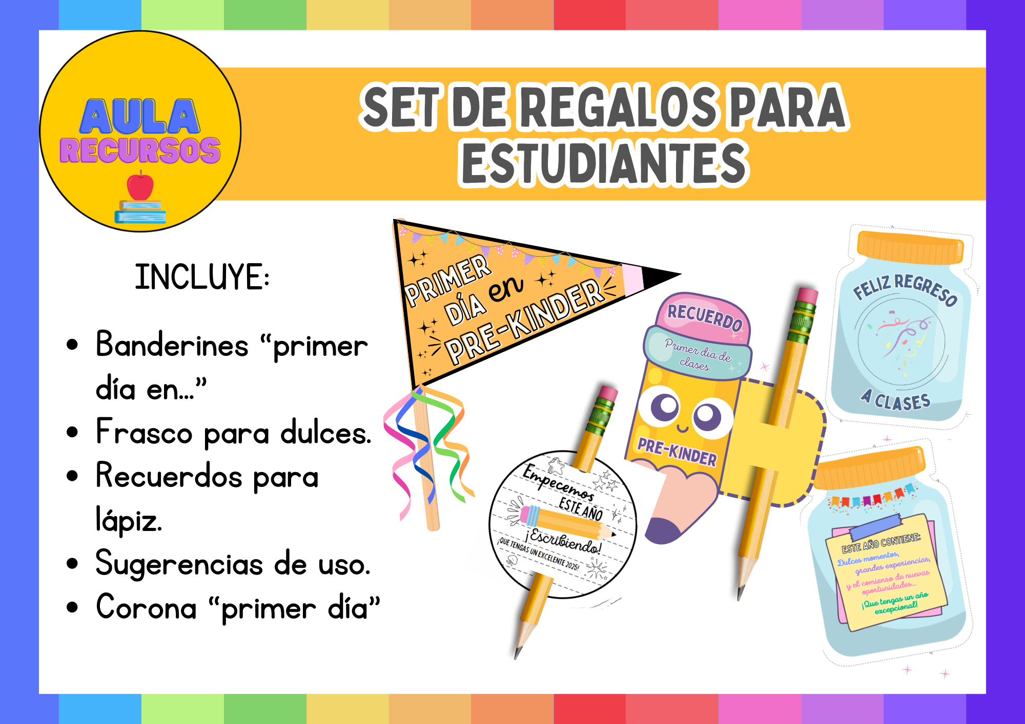 Haz que el primer día de clases sea inolvidable con este set de regalos para estudiantes, diseñado para darles una cálida bienvenida y motivarlos desde el inicio del ciclo escolar. Este pack incluye banderines, frascos decorativos, recuerdos para lápices y una corona especial, todo con un diseño colorido y atractivo.