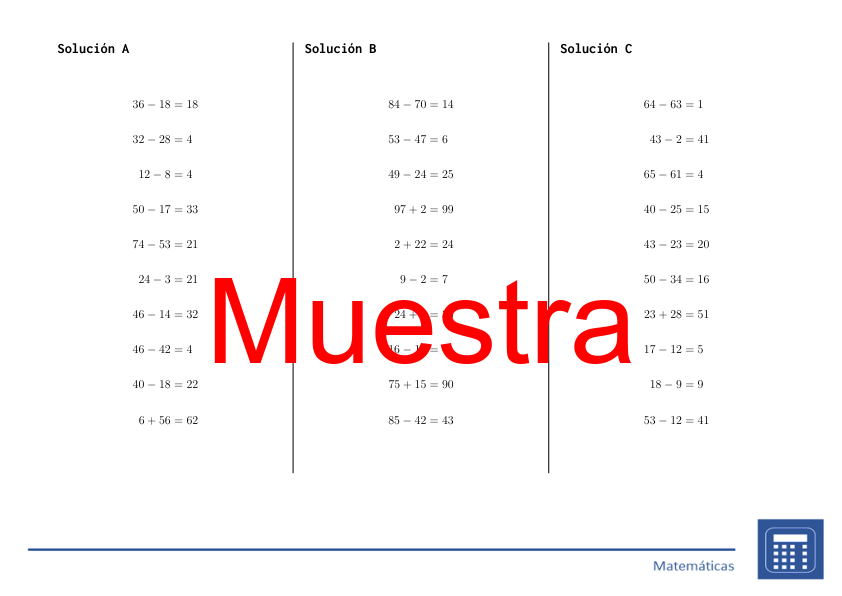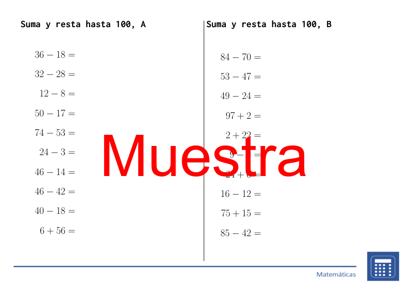 El material contiene 26 columnas (de la A a la Z) con 10 ejemplos (un total de 260 ejemplos) sobre Suma y resta hasta 100 junto con las soluciones de estas columnas. Además, en el documento se incluyen todas las 26 columnas (de la A a la Z) con la fuente ampliada al tamaño 20 para estudiantes con problemas visuales.