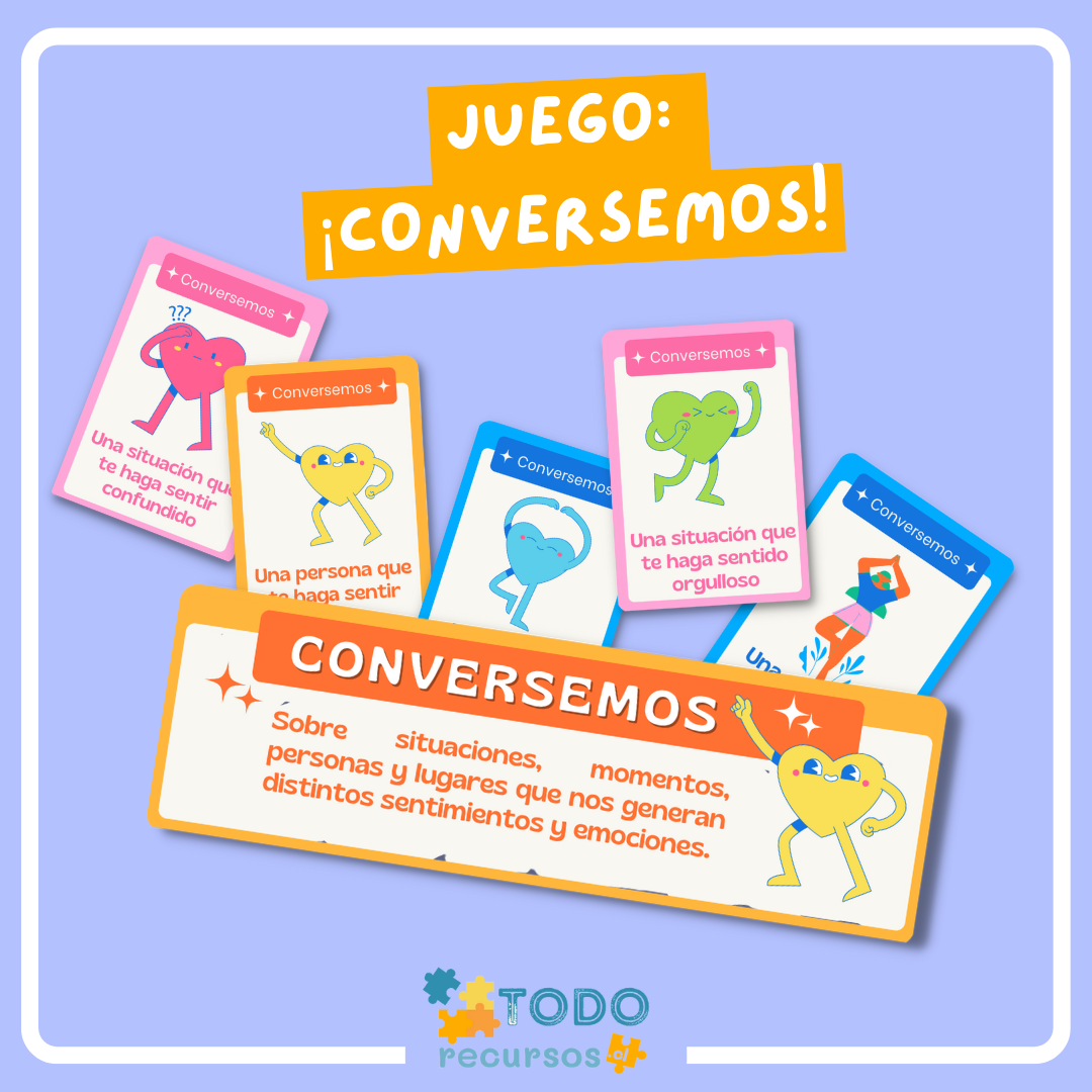 - Juego – ¡Conversemos de emociones!: Tarjetas para guiar conversaciones respecto a momentos, personas o lugares y las emociones o sentimientos que genera. (20 láminas)