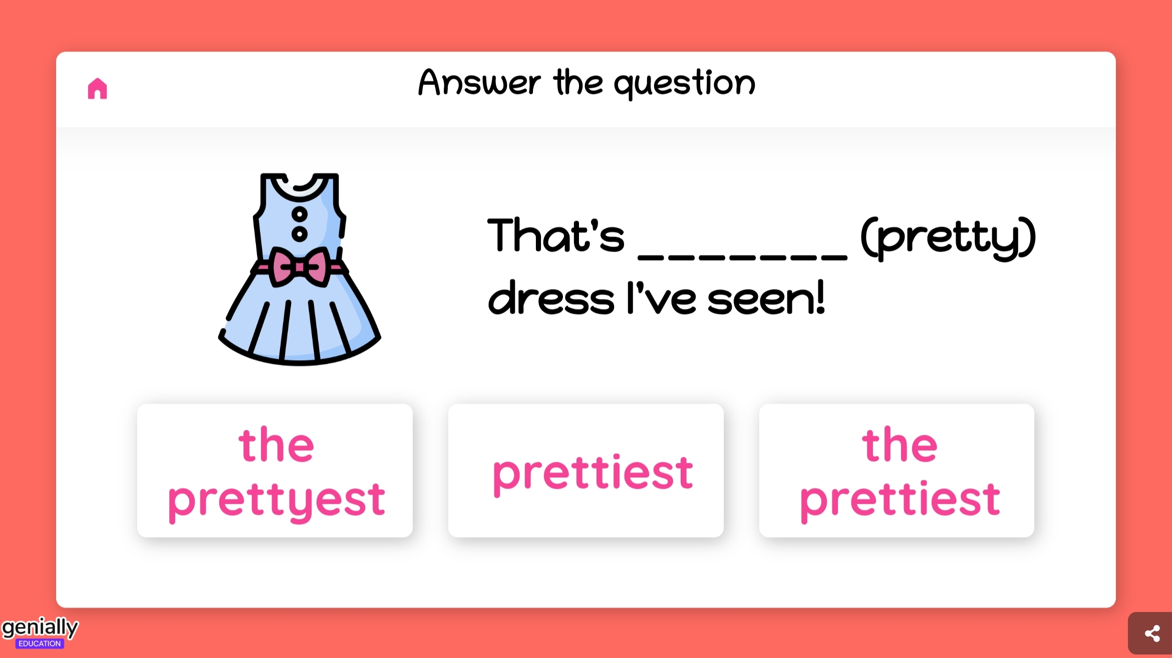 Una presentación para practicar el uso de superlatives con adjetivos de una sílaba, dos o más y los que terminan en -y. Con cada respuesta correcta, aparecerán más partes de la casa para completarla.