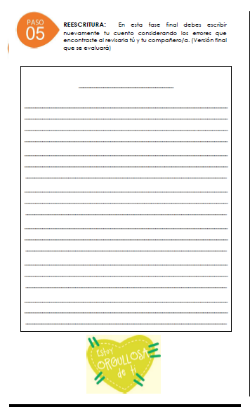 Incluye planificación, escritura borrador, auto y coevaluación, reescritura y rúbrica de evaluación.