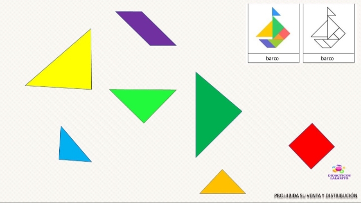 Seis diapositivas, con diferentes figuras que manejan dos niveles de complejidad (figura con color y figura sin color) para construir con las siete piezas que componen el tangram.