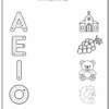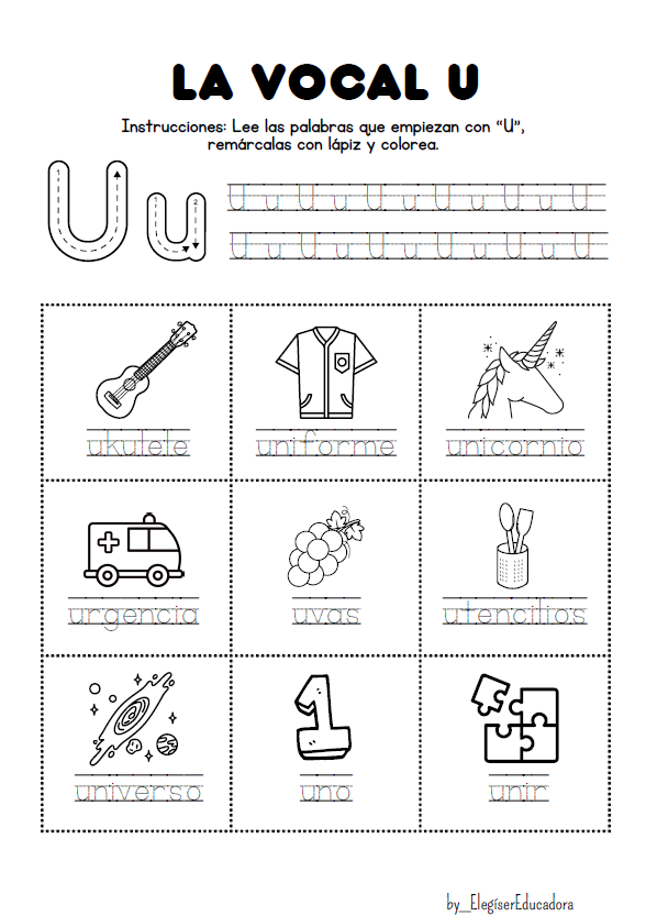 Trazado, Coloreo y Completar Palabras: La mayor parte del material presenta una vocal grande para ser trazada, junto con un dibujo (como “estrella” o “unicornio”) y un espacio para que el niño complete la palabra, reforzando la asociación de la vocal con palabras de uso común (ej. _na para “Ana”; _ma para “Ema”; _sa para “Osa” ).