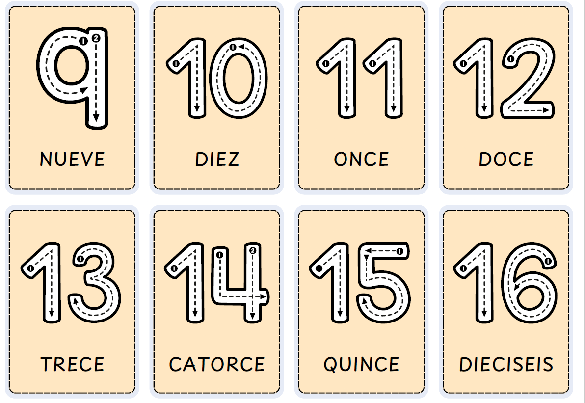 Formato: Muestra de forma clara el símbolo numérico (numeral) y su correspondiente nombre escrito (por ejemplo: “1 – UNO”, “20 – VEINTE”).