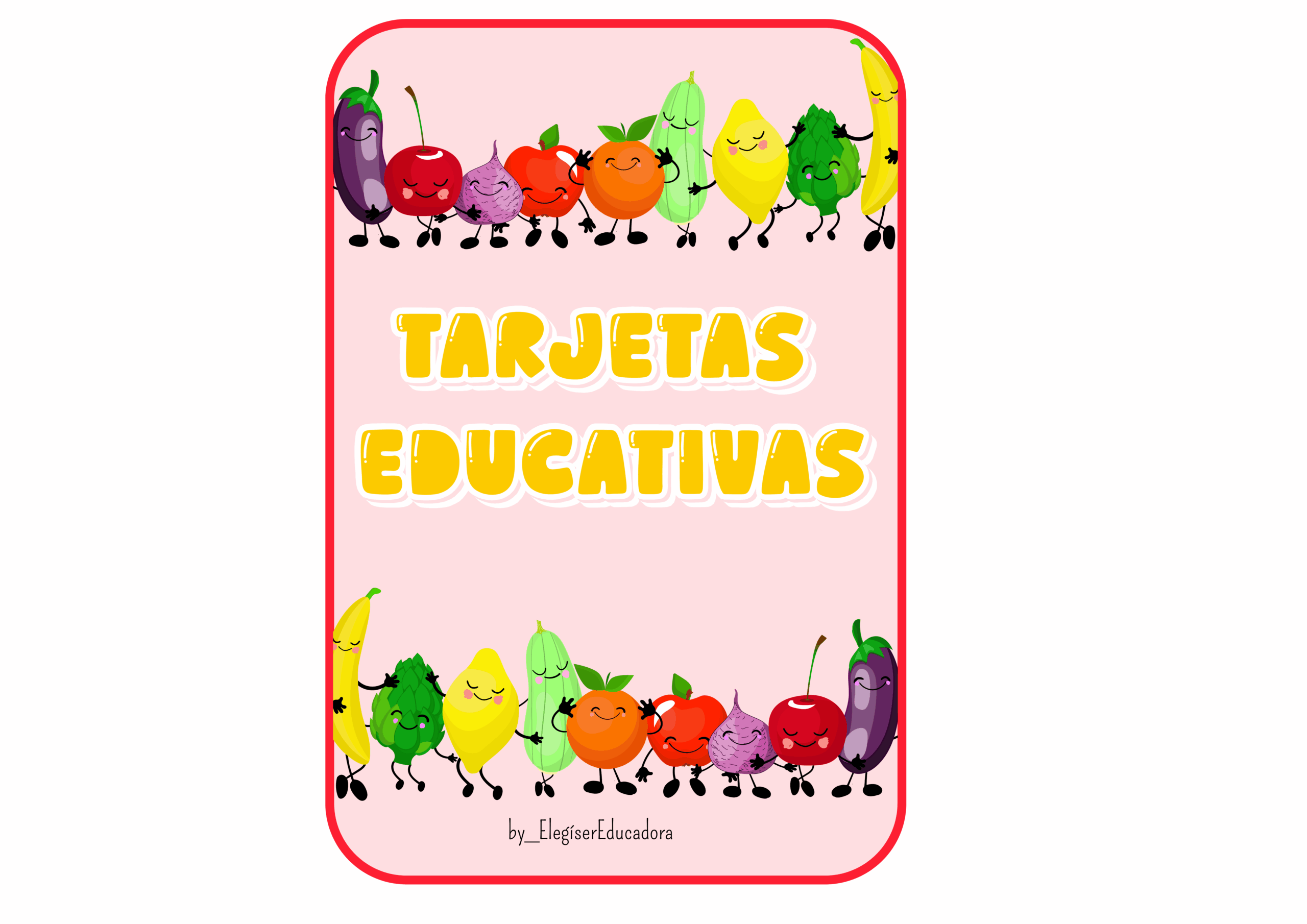 Tema y Contenido: Las tarjetas presentan un diseño alegre y colorido con personajes de frutas y verduras (como manzanas, piñas, maíz, calabazas, etc.).