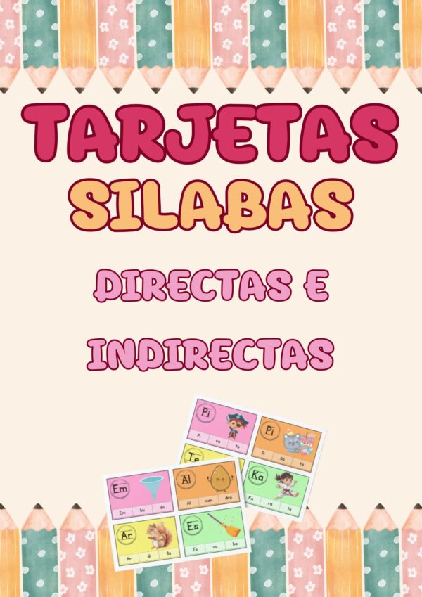 Este material está compuesto por tarjetas con palabras separadas en sílabas, que incluyen ejemplos de sílabas directas (consonante + vocal, como pa, me, so) e indirectas (vocal + consonante, como al, es, or).