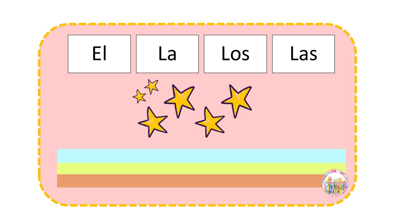 Para trabajar los artículos definidos e indefinidos de forma sencilla, visual y manipulativa; el que contiene una ilustración que puede tener Los Artículos definidos (determinantes) El, La, Los, Las o Los artículos indefinidos (indeterminantes) Un, Una, Unos, Unas. El estudiante viendo la imagen de la tarjeta deberá escoger y marcar el artículo que va delante de ese sustantivo y luego escribir en la plantilla la oración que se forma.
