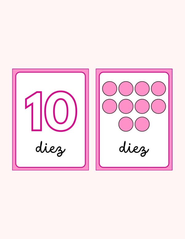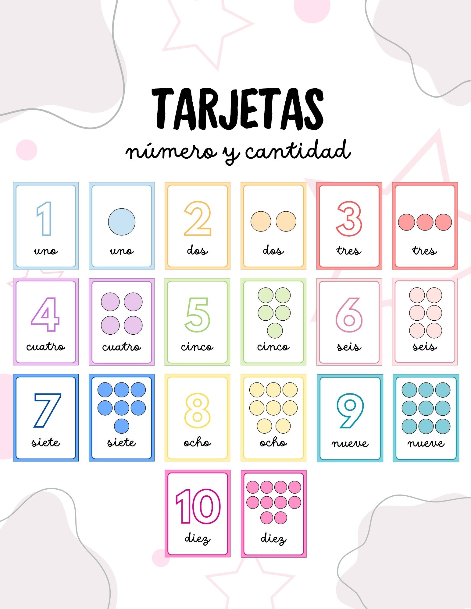 Conjunto de tarjetas para que los estudiantes aprendan los números y su grafía del 1 al 10.