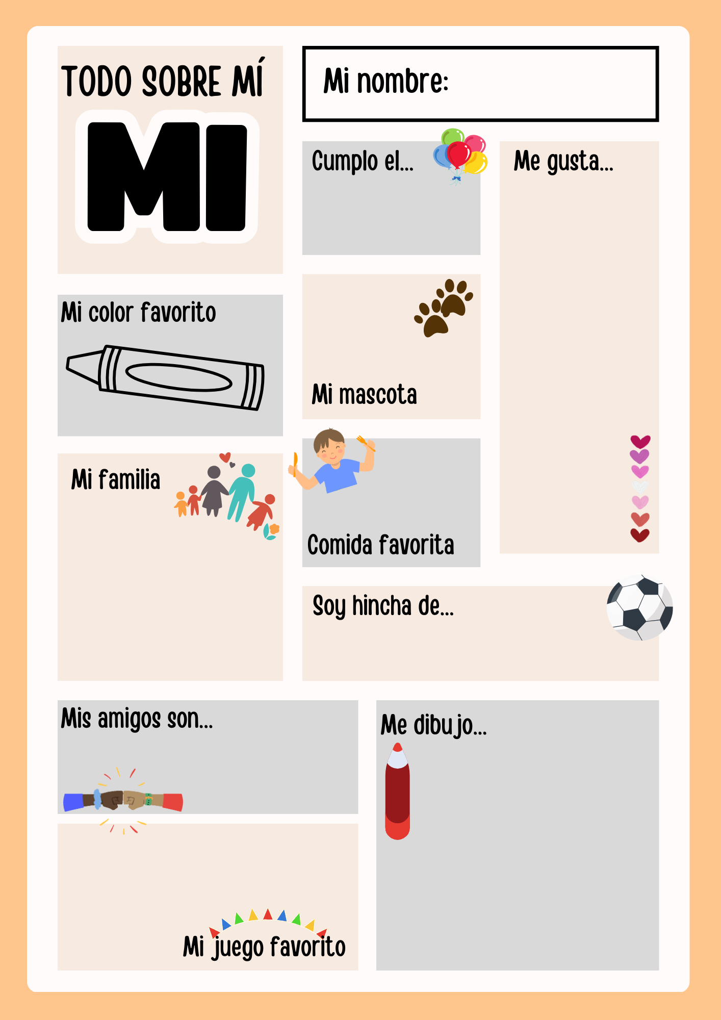 Los niños/as deben completar la planilla por escrito y dibujando, usando información sobre ellos mismos, como gustos, edad, datos personales.